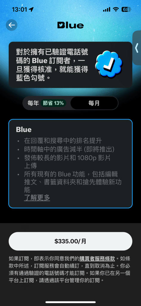 今天Twitter在台灣推出Twitter Blue,台灣的價格$335/月,$3500/年